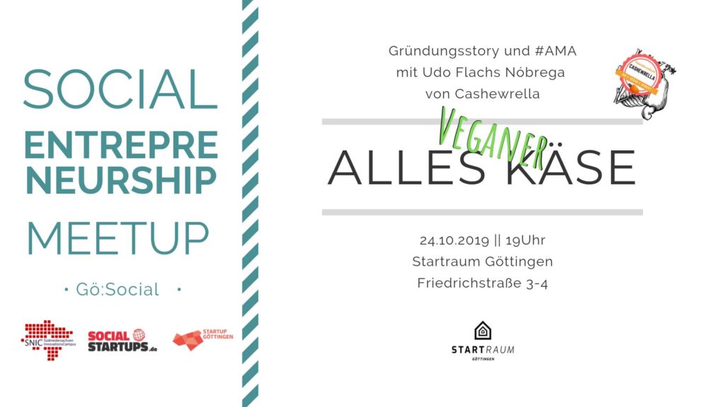 Vom Hobbykoch und Industriemechaniker zum Social Entrepreneur mit veganem Käse – das ist die Geschichte von Udo Flachs Nóbrega. Beim 8. Social Entrepreneurship Meetup Göttingen, das am Donnerstag, 24. Oktober, um 19 Uhr im StartRaum (Friedrichstraße 3/4, 37073 Göttingen) stattfindet, wird der Gründer des Göttinger Unternehmens „Cashewrella“ erzählen, wie er auf die Idee kam, selbstständig zu werden, und davon, wie er es schaffte aus der Industrie in den Social Entrepreneurship-Sektor zu wechseln. Veranstaltet wird das Meetup vom SüdniedersachsenInnovationsCampus (SNIC), social-startups.de, Startup Göttingen und StartRaum Göttingen.