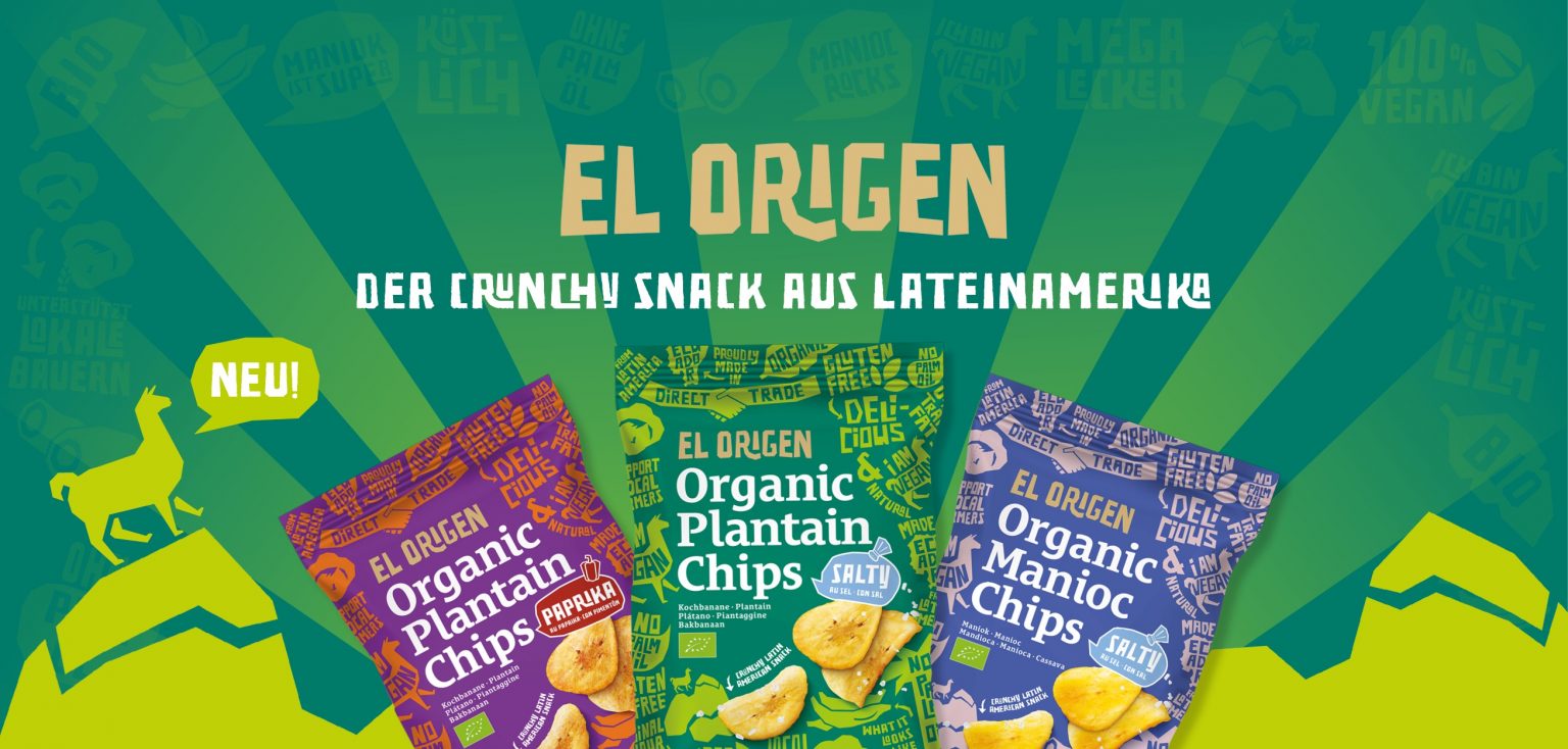 Der Markt für salzige Snacks boomt: Chips-Fans verzehren jährlich rund 64 Packungen der beliebten Produkte. Gleichzeitig befinden sich Ernährungsformen stetig im Wandel: Innovative Snacks liegen deshalb im Trend. Wie eine solche Innovation aussehen kann, zeigt das in Hamburg ansässige Unternehmen el origen food GmbH. Dieses möchte sich mit Chips aus Kochbananen und Maniokwurzeln am Markt für salzige Snacks und Gemüsechips etablieren und bietet so eine Alternative zu klassischen Kartoffelchips an. Der Genuss von qualitativen Snacks mit hochwertigen Zutaten steht hier im Mittelpunkt. Die Chips, welche mit Meersalz oder Paprika gewürzt werden, sind ab Dezember u.a. bei der Drogeriemarktkette Budni und den Denns Biomarkt Filialen zu finden.
