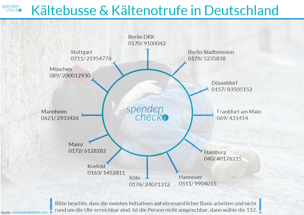 Die Aktion des Kältebusses hat bereits bundesweite Aufmerksamkeit erhalten, sodass nicht nur in Berlin die Kältebusse unterwegs sind. Eine zentrale Anrufstelle gibt es derzeit leider nicht, sodass Du je nach Standort eine andere Nummer anrufen musst. Wir haben Dir im Folgenden eine Übersicht zusammengestellt, der Du alle teilnehmenden Städte, Organisationen und Telefonnummern entnehmen kannst. Falls Du weitere Organisationen und Nummern hast, die in der Liste fehlen, würden wir uns freuen, wenn Du uns das in den Kommentaren wissen lässt. Diese nehmen wir dann gerne mit in die Liste auf.