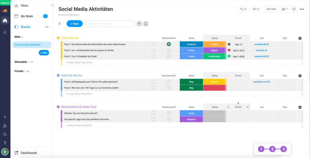 monday kennzeichnet sich durch eine hohe Benutzerfreundlichkeit. Wie factro und Asana ist das Tool intuitiv nutzbar und kann somit unkompliziert in Arbeitsprozesse eingeführt bzw. integriert werden. Durch die Hilfe von Widgets kann die Benutzeroberfläche individuell gestaltet werden, so lässt sich die Software schnell an unterschiedliche Einsatzzwecke anpassen.