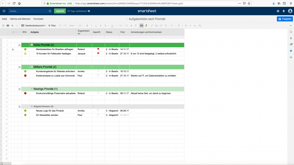 Auf den ersten Blick sieht Smartsheet aus wie das Tabellenkalkulationsprogramm Excel. Mitsamt Formeln ist dieses Blatt vollkommen frei gestaltbar und bildet somit die Basis für alle weiteren Ansichten, die Smartsheet anbietet.