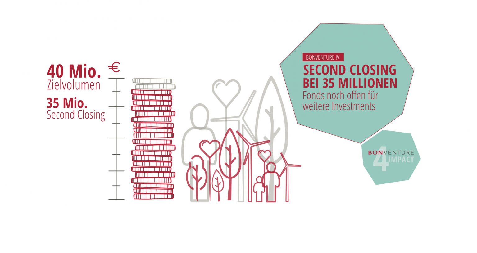 Der Münchner High-Impact-Investor BonVenture vermeldet das erfolgreiche Second Closing seines neuen Fonds BonVenture IV. Der Fonds investiert ausschließlich in Unternehmen mit sozialem oder ökologischem Geschäftszweck. Zum Zeitpunkt des Second Closing haben institutionelle und private Investor*innen 35 Millionen Euro gezeichnet. Weitere Investments sind noch bis Herbst 2021 möglich. Zielvolumen des Fonds sind 40 Millionen Euro.
