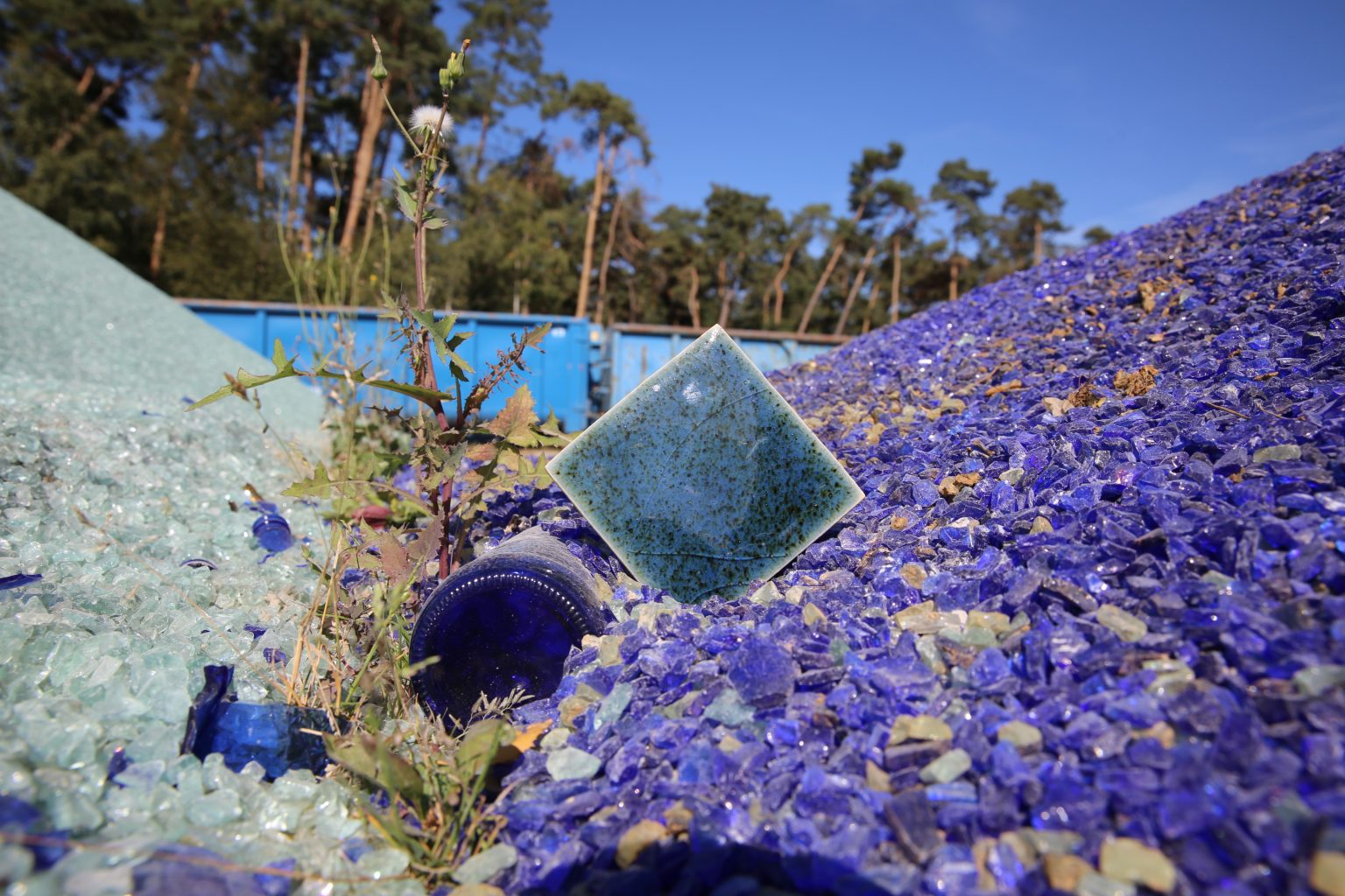 Fliesen von SHARDS werden aus alten Ziegeln oder recyceltem Glas hergestellt, die Lea, Leya und Moritz von Recyclingunternehmen beziehen. Schon vorsortiert zerkleinern Lea und ihr Team die Materialien und zaubern daraus Fliesen-Unikate in Creme, Ocker, Schwarz, Grün und Türkis. Schon verschiedene Sonneneinstrahlungen verändern die Farben der Materialien und damit auch das Endprodukt. Die Zusammensetzung, das Rezept für die Fliese sozusagen, hängt von dem gerade vorhandenen Bauschutt ab. „Unser Angebot an Fliesen ist immer das Essen der Saison“, erklärt Leya.